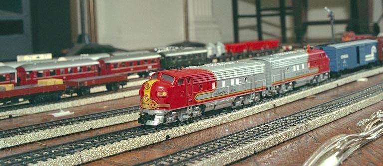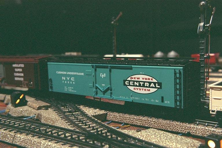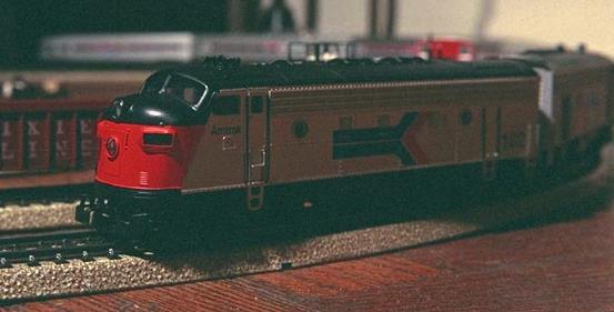 They are also "close-coupled", which means that the cars are joined with these fiendishly small plastic bars that carry current between them. Hooking the cars together is a careful process involving small tools and glasses and a lot of light, but the whole set runs with only 2 pickup shoes instead of 6, and so runs much faster. This set was produced in 1996, and I see it being traded back and forth on eBay every now and then, usually in the $900.00 plus range for both the Engines and the Car Set, except you can't get 'em together anymore. ;)