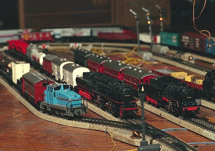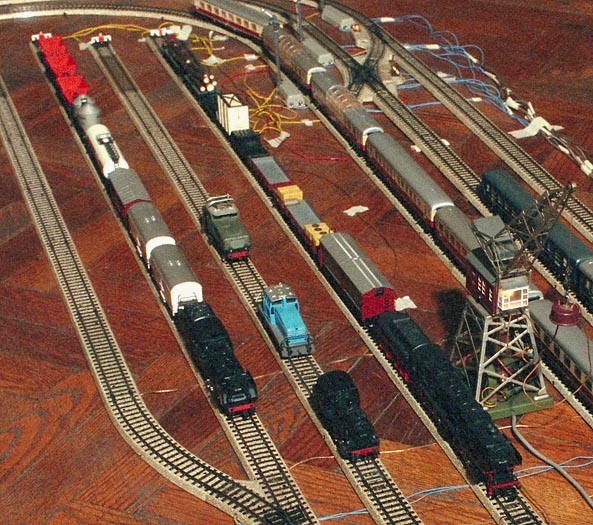 The Borsig is the Big Black Steam Engine, the medium sized one is my DB 24 Steppenferd, and the small one is the classic DB 89 that came in my Starter Set. The Blue diesal is a DHG 500 Industrial Switcher. The cars are various classic pieces of Märklin freight.